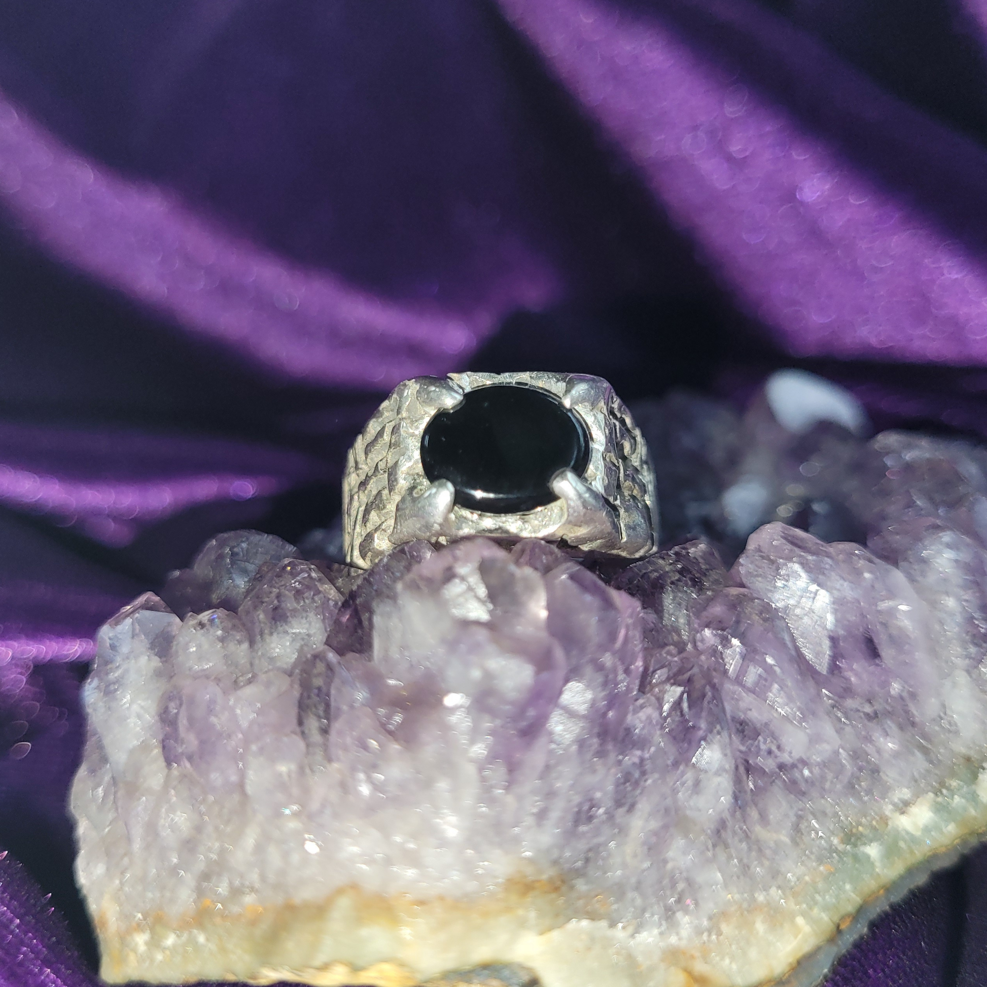 Stand inside the unbroken circle. This is no gentle halo; this is a siege wall cast in .925 sterling silver and crowned with a 7 × 9 mm cabochon of absolute black onyx. Size 9.5 | ½ inch tall | 7.5 grams of solid silver.